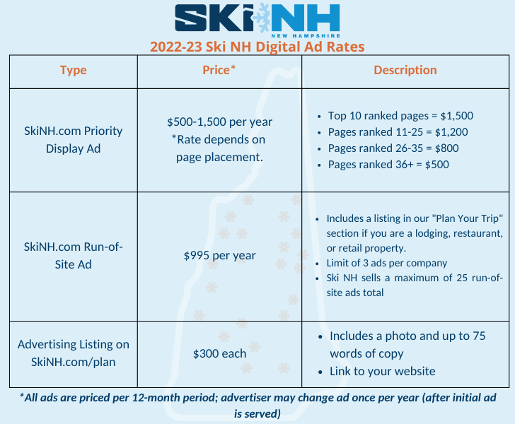 If you are hoping to boost your business to skiers, riders, and others seeking information about NH's ski areas throughout the year, advertising on SkiNH.com or in our Consumer Newsletter is the best way to go! Above is our current digital ad rate sheet. Note that our standard advertising cycle is November 1 through October 31.