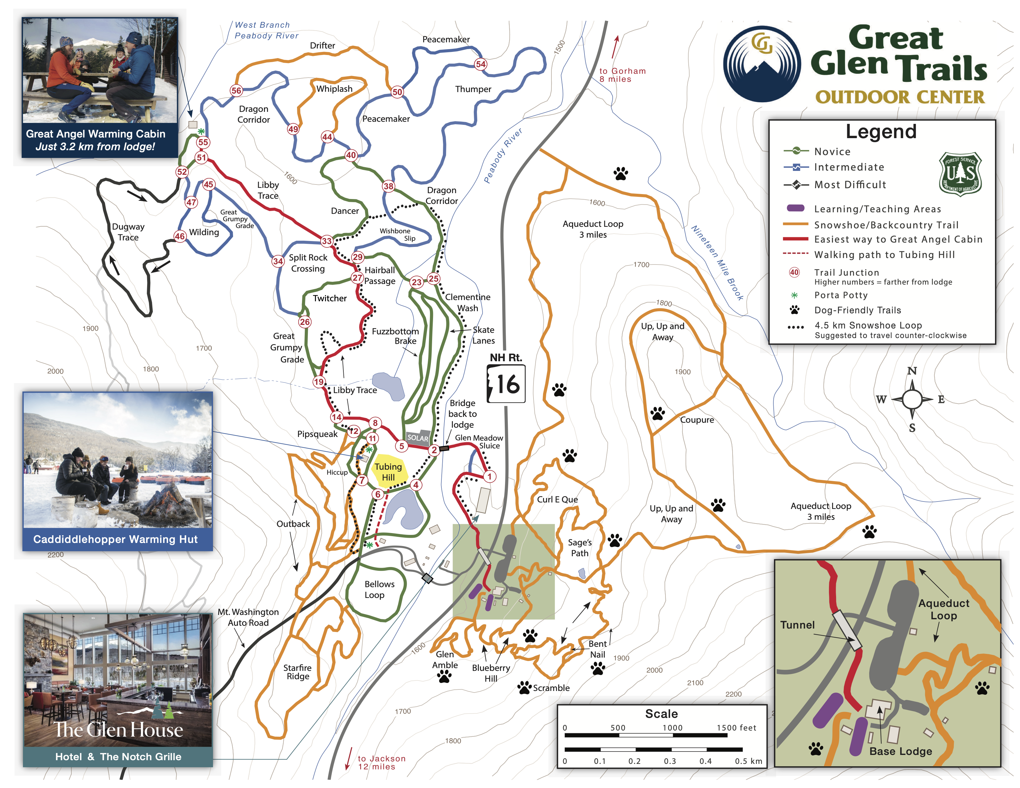 Located at the base of Mount Washington, Great Glen Trails is a winter wonderland for your family to explore. Enjoy Nordic skiing on perfectly groomed trails, old-fashioned snowtubing, snowshoeing through birch forests with spectacular views of the Presidential Range. With over 30 years of service to locals and ski teams, Great Glen Outfitters has proved itself to be THE place to shop for Nordic Skiing. Selection and service for both clothing and equipment are topnotch. Our expansive rental shop includes new equipment each season using the latest in product technology.
